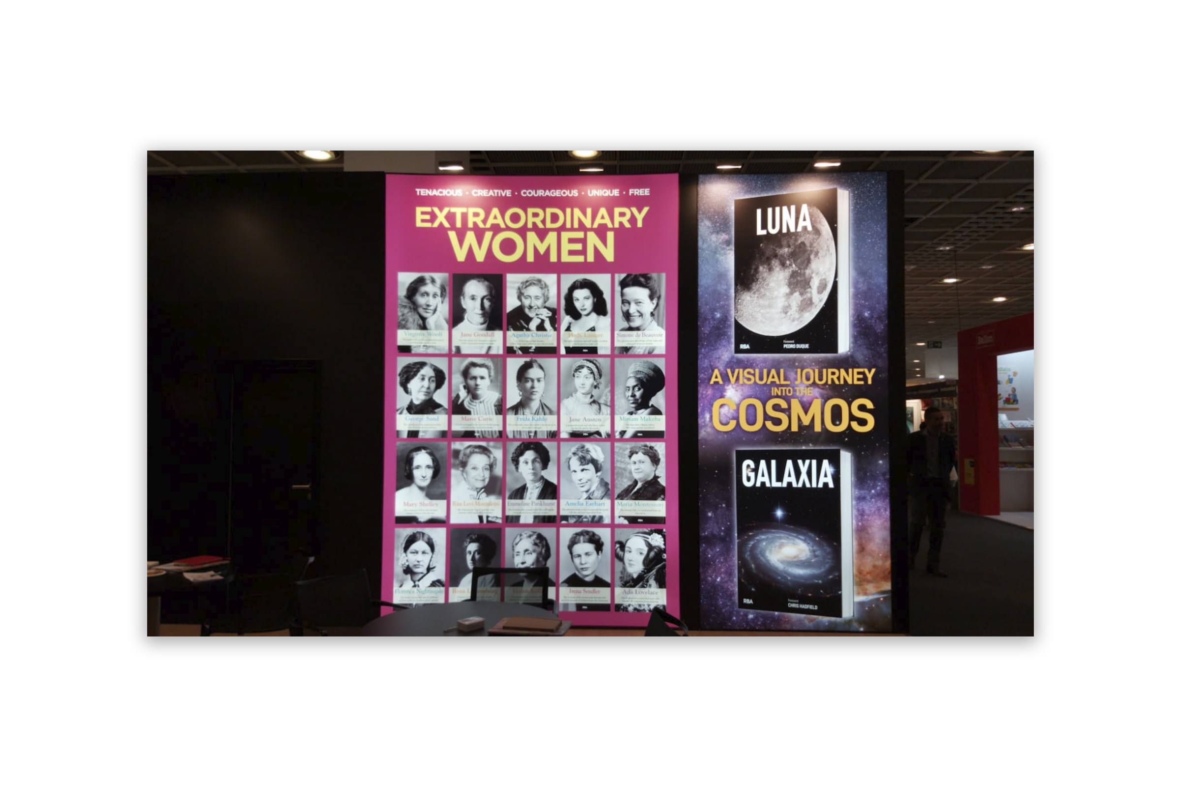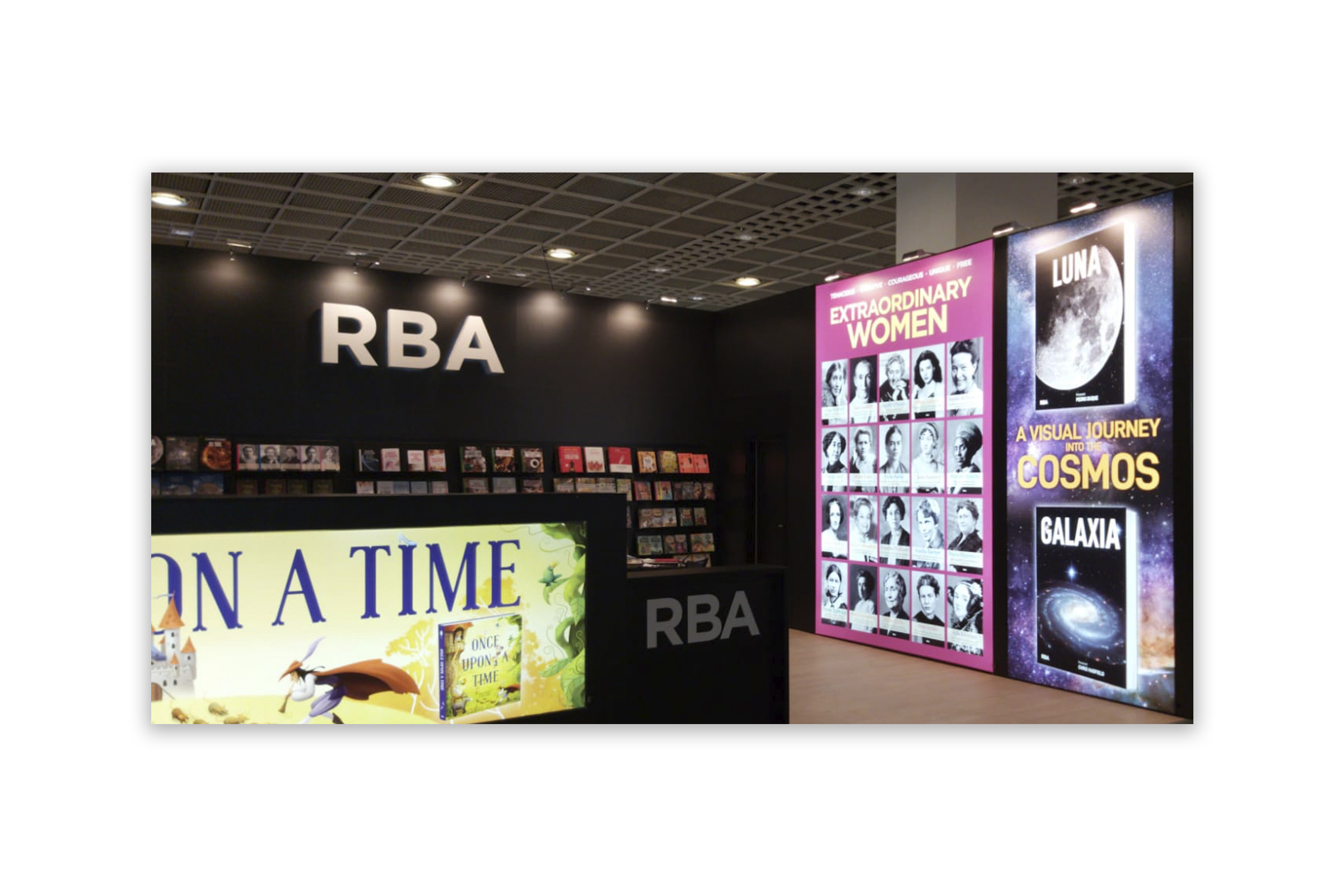 Realización del diseño de los plafones del stand de RBA Libros en la Feria del Libro de Frankfurt 2019. (El plafón Once Upon a Time corresponde a otro estudio de diseño).