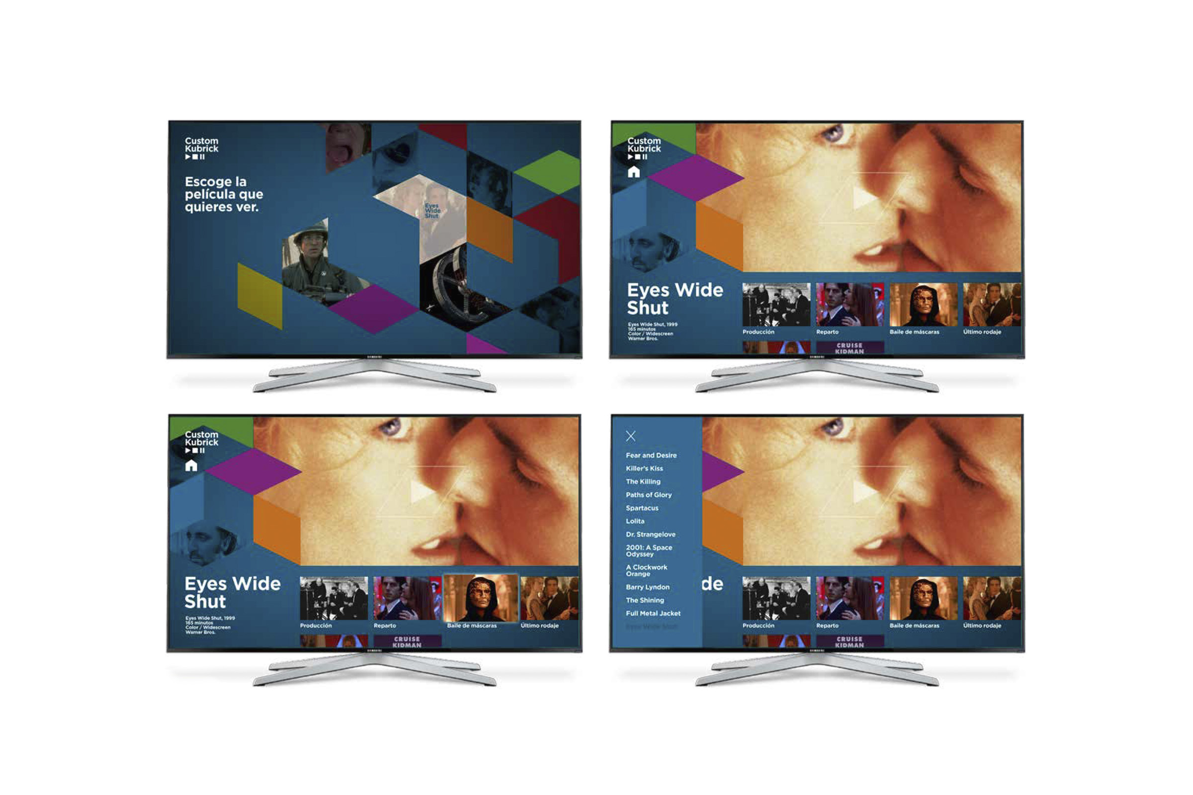 Proyecto final del Máster en Diseño Gráfico y Digital en EINA (Barcelona), 2017. App para TV (Apple TV) para una exposición sobre la figura del director Stanley Kubrick titulada "Custom Kubrick".